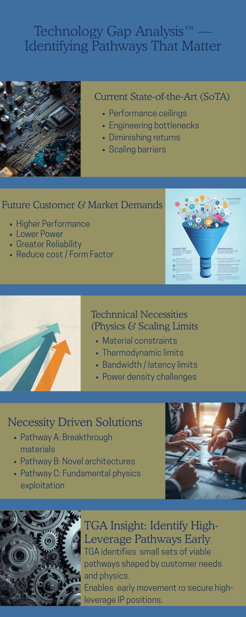 Technology Gap Analysis™ (TGA), a collaborative effort between engineers and lawyers, identifies the solution pathways with the highest likelihood of attracting industry focus - not through prediction, but because evolving customer needs and technical constraints narrow the set of viable approaches. This enables founders to secure strategic ground before competitors understand its importance.